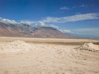 A picturesque landscape in California, USA. The rugged mountains provide a stunning backdrop to the open space. A dirt track cuts through the grassy plains, while clouds dot the horizon. Explore the off-road trails and experience the beauty of this desert valley.