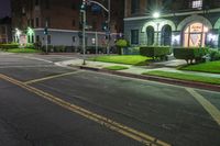 a night time street with the lights on and some shrubs in the road nearby at night