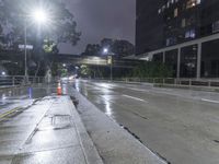 An urban cityscape of Los Angeles at night, showcasing modern architecture and bustling city streets. The city's iconic skyline reflects beautifully on the wet road surface. Artificial lights illuminate the highways' entry and exit ramps.