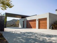 This is an image of a modern residential villa in Los Angeles, California. The low-rise house features a sleek and minimalist design, showcasing the city's modern architecture. The clear sky above highlights the concrete surfaces of the home and the surrounding area. In front of the villa, there is a parking garage with electric charging stations, representing the city's commitment to sustainable living. This photo captures the essence of a sunny day in Los Angeles, where modern architecture meets green technology.