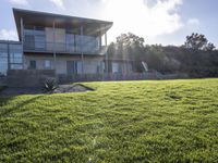 A modern residential home in Los Angeles, California, surrounded by a spacious lawn and lush vegetation. This suburban retreat offers an open space with clear skies and plenty of sunny days. The perfect property for enjoying the sunshine and outdoor living.