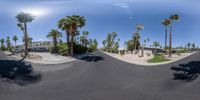 the camera pans up to reveal trees and palm trees on the sidewalk in the foreground