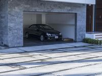 Modern architecture of a California villa with a sleek mid-size car parked in the garage. The concrete surfaces contrast with the lush greenery of the surrounding landscape. A luxurious home in Los Angeles.