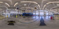 A spacious industrial building in Los Angeles, California, with large arched ceilings and a circular floor plan. Vehicles can be seen from an overhead view, reflecting off the glass and metal surfaces. This open space is perfect for manufacturing or automotive purposes.