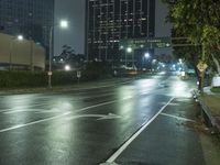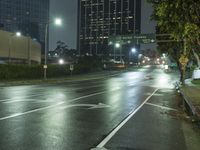 This image captures the vibrant cityscape of Los Angeles, California, USA at night. The modern architecture and street lights create a stunning reflection on the wet roads and crosswalks. The fog adds an element of mystery to the scene. The coastal location can be seen in the background, with water resources and the skyline visible. This photo represents the urban and metropolitan atmosphere of Los Angeles, with its artifical lights and mode of transport. It is a snapshot of the energetic and bustling city of Los Angeles at night.