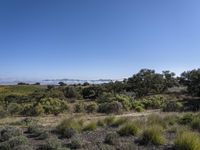 Rugged off-road track in California's wilderness. Open space filled with shrubs and grass surface, surrounded by majestic mountains. A perfect day for recreational adventure in the wilderness.