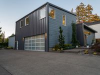 This image captures a modern residential villa in California, USA. The house is surrounded by lush vegetation and tall trees, with a clear sky above. The villa features large windows and wooden fixtures, adding to its contemporary architecture. A concrete road leads up to the driveway and entry of the property. The dawn light enhances the beauty of this home, showcasing its modern design against the natural landscape. This photo represents the blend of nature and modern living in California.