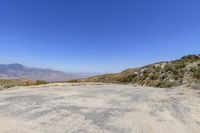 A remote Californian desert landscape with mountains in the background. An empty parking lot is surrounded by a natural environment of hills and trees. Clear blue sky adds to the serene beauty of this rural wilderness.