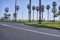 palm trees are lining the road at a public park on a beach day next to the ocean