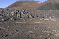 This is an image of a rugged desert landscape in California, USA. The photo captures the open space, dirt tracks, and rocky terrain of the area. The mountain landforms and rock formations create a stunning backdrop against the clear sky. The profile of the landscape shows hills, gravel, and bedrock, showcasing the geology of the region. The surface of the rocks and rubble adds to the ruggedness and natural beauty of the scene. This photo represents the unique and diverse nature of California's desert landscape.