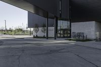 A modern office building in Toronto's financial district. The clear sky contrasts with the low-rise concrete architecture. Tree-lined roads and urban design create a vibrant city life in Canada's business and financial hub.