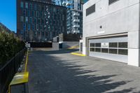 a parking garage is next to an industrial warehouse building with large windows in it, on the side of a city street