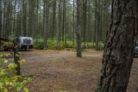 two vehicles in the woods parked next to each other near a road and some trees