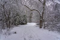 the trail leads up into the trees in the snow, with tracks in the road