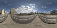 this is a fisheye panoramic view of a cityscape in a 360 camera lens