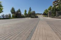 A picturesque landscape of the Okanagan Valley in British Columbia, Canada. A straight road leads through the residential area of Glenmore, lined with nature and trees. The clear sky enhances the beauty of this rural scene.