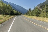 A scenic landscape in British Columbia, Canada. The road traverses through the mountains and forests, surrounded by lush vegetation. Clear sky above highlights the beauty of the highland region.