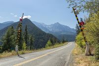 A picturesque landscape in British Columbia, Canada. The asphalt road winds through lush green highlands, surrounded by majestic mountains. Clear skies above bring out the vibrant colors of nature.