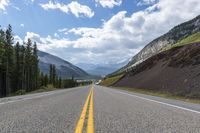 This image captures the scenic landscape of an empty highway in Alberta, Canada. The road meanders through the mountains, flanked by tall pine trees on either side. The straight yellow lines on the asphalt surface give a sense of direction and lead the viewer's eye along the road. The clouds above add a touch of drama to the natural setting. This photo represents the beauty of nature and the well-maintained infrastructure in the highlands of Alberta.