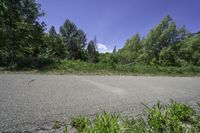 An empty road in Toronto, Ontario, lined with lush green trees and bushes. The clear sky contrasts with the vibrant nature of the landscape. A tree branch rests on the curb, adding to the serene atmosphere.