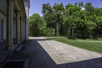 This is an image of a historic castle in Ontario, Canada. The classic architecture of the castle is set against a clear sky. The lush green vegetation surrounds the castle, creating a beautiful and scenic landscape. The road in front of the castle is made of gravel, giving it a rural and historic feel. The sunlight shines down on the castle, highlighting its architectural details. This image represents the perfect blend of historic architecture, natural beauty, and tourist attractions in Ontario, Canada.