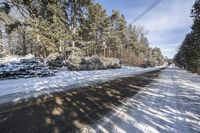 This is an image of a rural landscape in Ontario, Canada. The photo captures a road surrounded by dense forests and vegetation. The snow-covered ground reflects the winter season in Ontario. The clear sky and clouds create a picturesque backdrop. The image showcases the natural beauty of the area, with trees, branches, and twigs visible in the foreground. The road surface, asphalt, and hard shadows from the trees contribute to the overall composition. This photo represents the peaceful and scenic countryside of Ontario near Toronto.