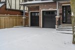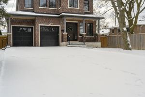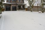 A residential area in Canada covered in snow. A house sits on a snow bank in the yard, with a sign indicating the property. The grey sky adds to the winter ambiance.