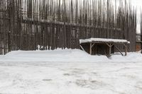 a large wooden structure covered with snow by a tree line fence with a cow in the background
