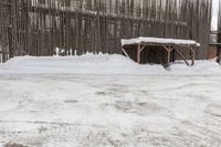 snow covered area in front of wooden structure and building in distance, with one snowy bench in the middle of it