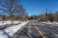 This is an image of a straight road in a suburban area of Ontario, Canada. The road is made of asphalt and stretches into the distance under a clear sky. Surrounding the road are residential buildings and suburban parks, creating a peaceful and recreational atmosphere. This photo represents a typical day in the suburbs of Ontario, showcasing the suburban lifestyle and the well-maintained roads. It is a perfect image for showcasing the beauty and tranquility of suburban living in Canada.