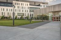 This photo captures the modern architecture and urban design of a building in Toronto, Canada. The concrete surface and glass windows of the building reflect the clear sky and clouds above. In the foreground, a skateboard stands on the concrete slabs, representing the active and vibrant nature of the city. Surrounding the building is a well-maintained grassy area, adding to the appeal of the residential neighborhood. This image represents a typical day in the bustling business district of Toronto.