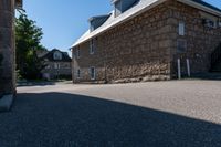 This image captures the tranquility of a suburban street in Toronto, Canada. The clear sky overhead casts hard shadows on the asphalt surface, adding depth to the scene. The street is empty, with a brick building and sidewalk on one side. An entrance ramp leads to the building, creating a sense of invitation. This photo represents a typical day in a residential neighborhood in Toronto.
