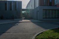 A daytime view of a suburban residential area in Toronto, Canada. Asphalt road surfaces and driveways lead to residential and office buildings. Urban design features include curbs and vegetation. Hard shadows create a dramatic effect.