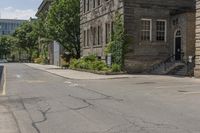 A vibrant city scene in Toronto, Canada. Classic architecture lines the streets as pedestrians walk along the well-maintained road. Trees provide shade in the park-like public spaces, while a busy parking lot shows the bustling city life.