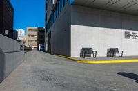 This is an image of a long city street in Canada, specifically in the cities of Montreal and Toronto. The road stretches straight ahead, flanked by sidewalks and benches painted in white and yellow to match the urban design. The day is bright, with a clear sky overhead. This photo captures the essence of city life, with bustling activity and urban infrastructure in the background. It represents the vibrant and dynamic atmosphere of these Canadian cities.