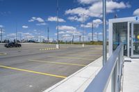 A panoramic view of the city of Toronto, showcasing the architecture and infrastructure. The clear sky reflects on the glass walls of the high-rise buildings. Roads and parking lots provide ample space for vehicles. The city buzzes with activity from bus stops to stadiums.