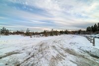 a rural road is covered in snow and drifts off the ground, with lots of trees, and other wintering