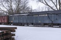A gloomy winter day in Toronto, Canada. The grey sky casts a somber tone over the industrial landscape. Buildings, factories, and railroad tracks create a dreary atmosphere. A train rolls along the snowy surface, a mode of transport amidst the freezing winter.