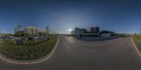 a 360 - view of cars parked on the street at dusk and sun peeking over the buildings