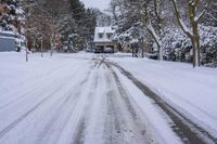 This is a photo taken at dawn in Ontario, Canada. The image shows a straight road stretching into the distance, surrounded by residential buildings and houses. The road surface is made of asphalt and is covered with a thin layer of snow. The trees and vegetation on the sides of the road add a touch of winter to the landscape. The overall atmosphere is gloomy, with a grey sky and clouds overhead. This photo represents a typical morning scene in a rural area of Ontario.
