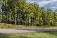 A scenic landscape in Alberta, Canada. The asphalt road winds through the lush forest, surrounded by towering evergreen trees. The sky is dotted with fluffy clouds, casting a gentle shade over the land below.