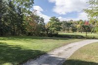 This is an image of a lush landscape in Ontario, Canada. The photo captures a beautiful autumn day with green grass, vibrant trees, and colorful leaves. The sunlight shines through the clouds, creating a play of light and shade on the groundcover. A gravel path leads through the forest, providing a recreational area for visitors. This picture represents the natural beauty of Ontario, with its vast forests, well-maintained parks, and recreational spaces. It is a perfect illustration of the serene and inviting environment found in Toronto, Canada's largest city.