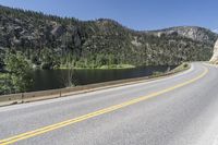 A scenic mountain road in British Columbia, Canada. The asphalt road winds through the highlands, surrounded by lush vegetation and towering trees. Clear skies and a sloping landscape create a breathtaking natural landscape.