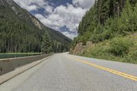 A scenic mountain road in British Columbia, Canada. Surrounded by lush forests and stunning landscapes, the road winds through highlands and offers a straight-down-the-road POV. The road surface hugs the slope, with vegetation and larch trees lining the way. A perfect day for nature lovers.