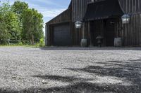 This image showcases a low-rise building in a rural area of Ontario, Canada. The architecture features a facade made of rough, rugged materials, blending with the natural surroundings. The property is surrounded by open spaces, grass, and trees. A gravel driveway leads to the building, which can be used as a home or a shed for agricultural purposes. The road surface is made of asphalt, providing access to the property. This picturesque scene captures the essence of rural living in Ontario, where real estate with ample parking space and land lots can be found.