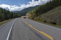 This is a beautiful landscape image taken in Alberta, Canada. The photo captures a winding asphalt road surrounded by lush forests and majestic mountains. The clear blue sky is adorned with fluffy white clouds, creating a picturesque scene. The sloping terrain and abundant vegetation add to the natural beauty of the area. This photo represents the stunning natural environment of Alberta, where the highlands meet the foothills. It showcases the perfect blend of infrastructure and nature, making it an ideal destination for adventure and exploration.