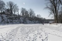 This is a scenic image of a frozen lake in Toronto, Canada. The winter landscape features snow-covered trees and branches, with clear skies and sunlight reflecting off the icy surface of the lake. The open space and rural surroundings create a peaceful and natural environment. The image showcases the beauty of Canada's winter season, with freezing temperatures and a serene atmosphere. The road surface and vegetation in the background add depth to the composition. This photo captures the essence of the Canadian countryside in winter.
