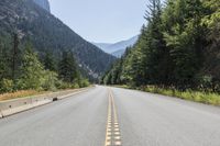 A straight road stretches through the beautiful Canadian landscape in British Columbia. Surrounded by mountains, forests, and lush vegetation, it leads to the town of Lillooet. The clear sky and tar road surface make for a perfect day of driving.