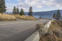 An asphalt road winds through the picturesque coastal landscape of West Kelowna in British Columbia, Canada. The road hugs the mountain slope, overlooking Okanagan Lake. Clouds hover above, adding drama to the scenery.