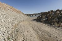 A rugged dirt road in the Okanagan Valley of British Columbia, Canada. The road surfaces are made of gravel and rubble, surrounded by towering trees and rocky outcrops. The clear sky showcases the breathtaking landscape of Kelowna.